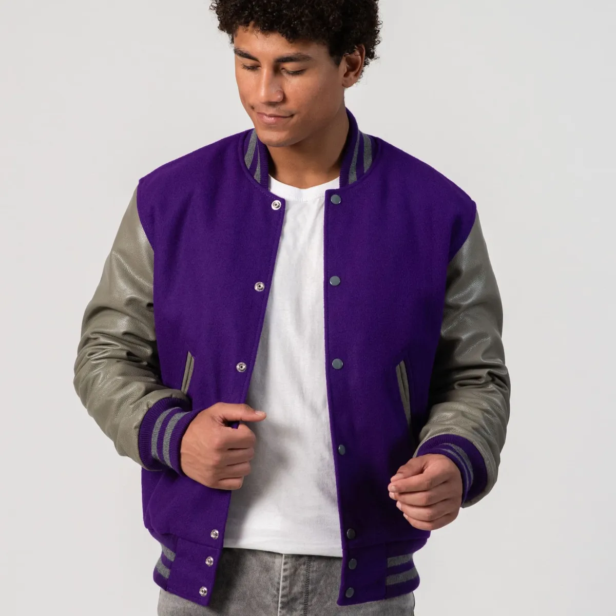 Purple body made with color-fast heavyweight 24-ounce wool (80% wool and 20% nylon).Grey sleeves made with premium quality cowhide real leather.Knit stand-up style collar made of pink acrylic wool.High quality metal snaps covered with grey acrylic paint.Deep pockets with bright white cowhide leather finish.Two color acrylic wool.100% Black polyester taffeta with quilted stitching.