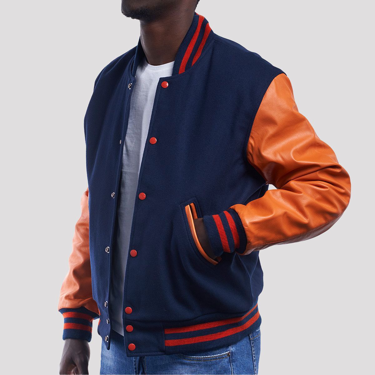 Royal body made with color-fast heavyweight 24-ounce wool (80% wool and 20% nylon).Orange sleeves made with premium quality cowhide real leather.Knit stand-up style collar made of royal acrylic wool.High quality metal snaps covered with burnt orange acrylic paint.Deep pockets with burnt orange cowhide leather finish.Royal acrylic wool.100% Black polyester taffeta with quilted stitching.