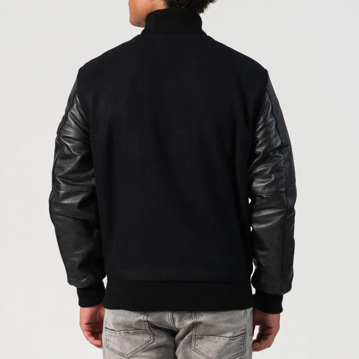 Black body made with color-fast heavyweight 24-ounce wool (80% wool and 20% nylon).Black sleeves made with premium quality cowhide real leather.Knit stand-up style collar made of black acrylic wool.High quality metal snaps covered with black acrylic paint. Deep pockets with black cowhide leather finish.Black acrylic wool.100% Black polyester taffeta with quilted stitching.