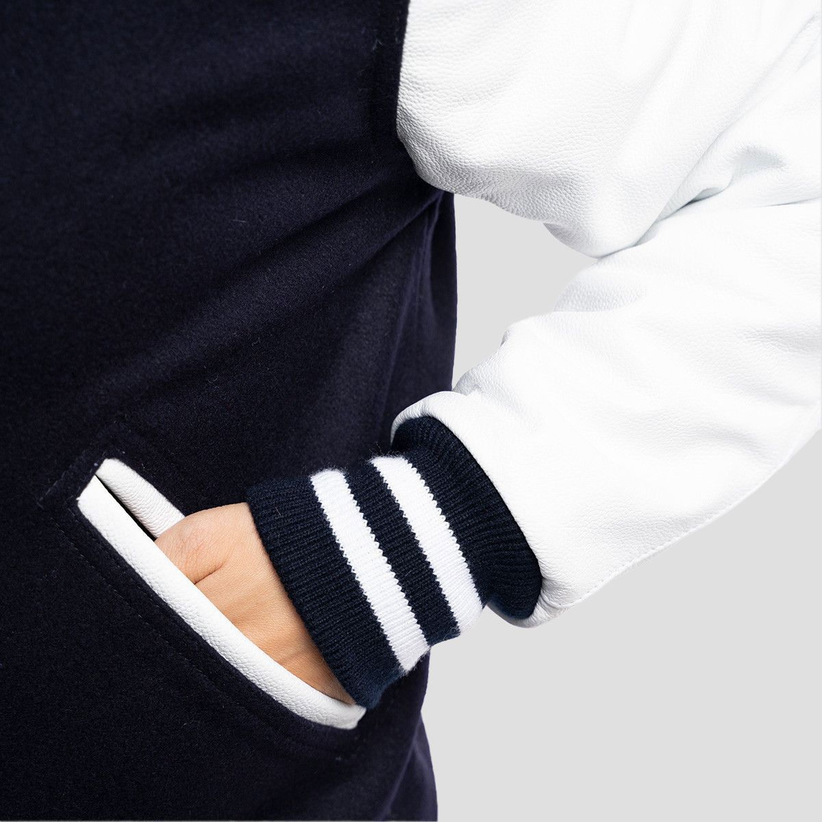 Navy blue body made with color-fast heavyweight 24-ounce wool (80% wool and 20% nylon).Knit stand-up style collar made of acrylic wool.Bright white sleeves made with premium quality cowhide real leather.High quality metal snaps covered with bright white acrylic paint.Deep pockets with bright white cowhide leather finish.Two color acrylic wool.100% Black polyester taffeta with quilted stitching.