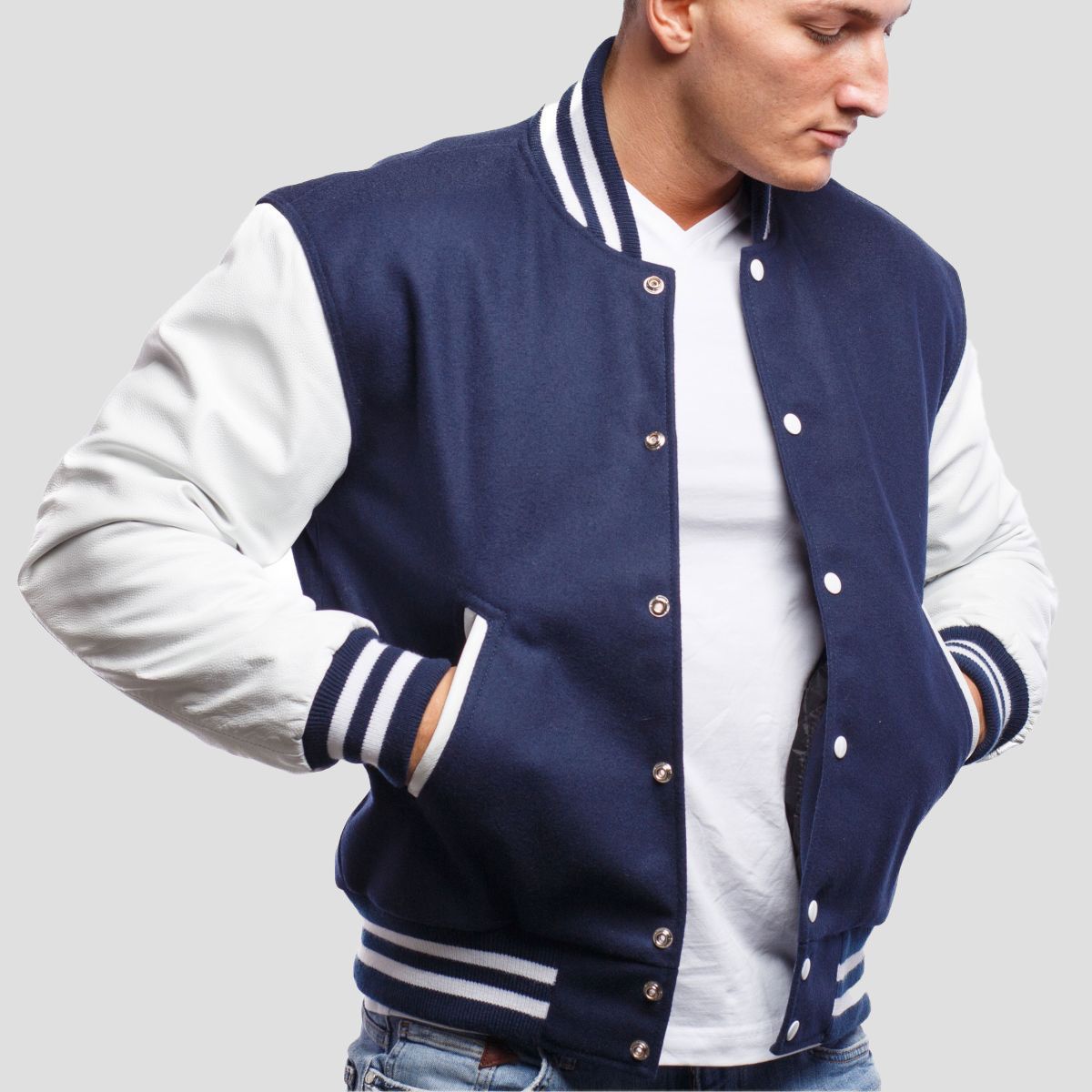 Royal blue body made with color-fast heavyweight 24-ounce wool (80% wool and 20% nylon).Knit stand-up style collar made of acrylic wool.Bright white sleeves made with premium quality cowhide real leather.High quality metal snaps covered with bright white acrylic paint. Deep pockets with bright white cowhide leather finish.Two color acrylic wool.100% Black polyester taffeta with quilted stitching.