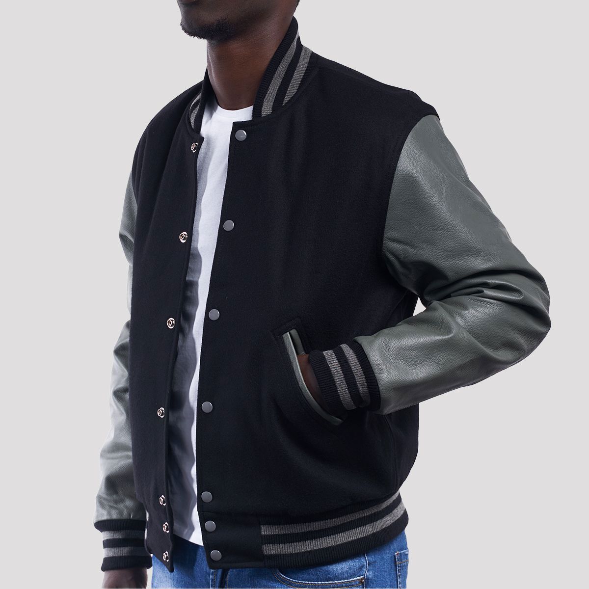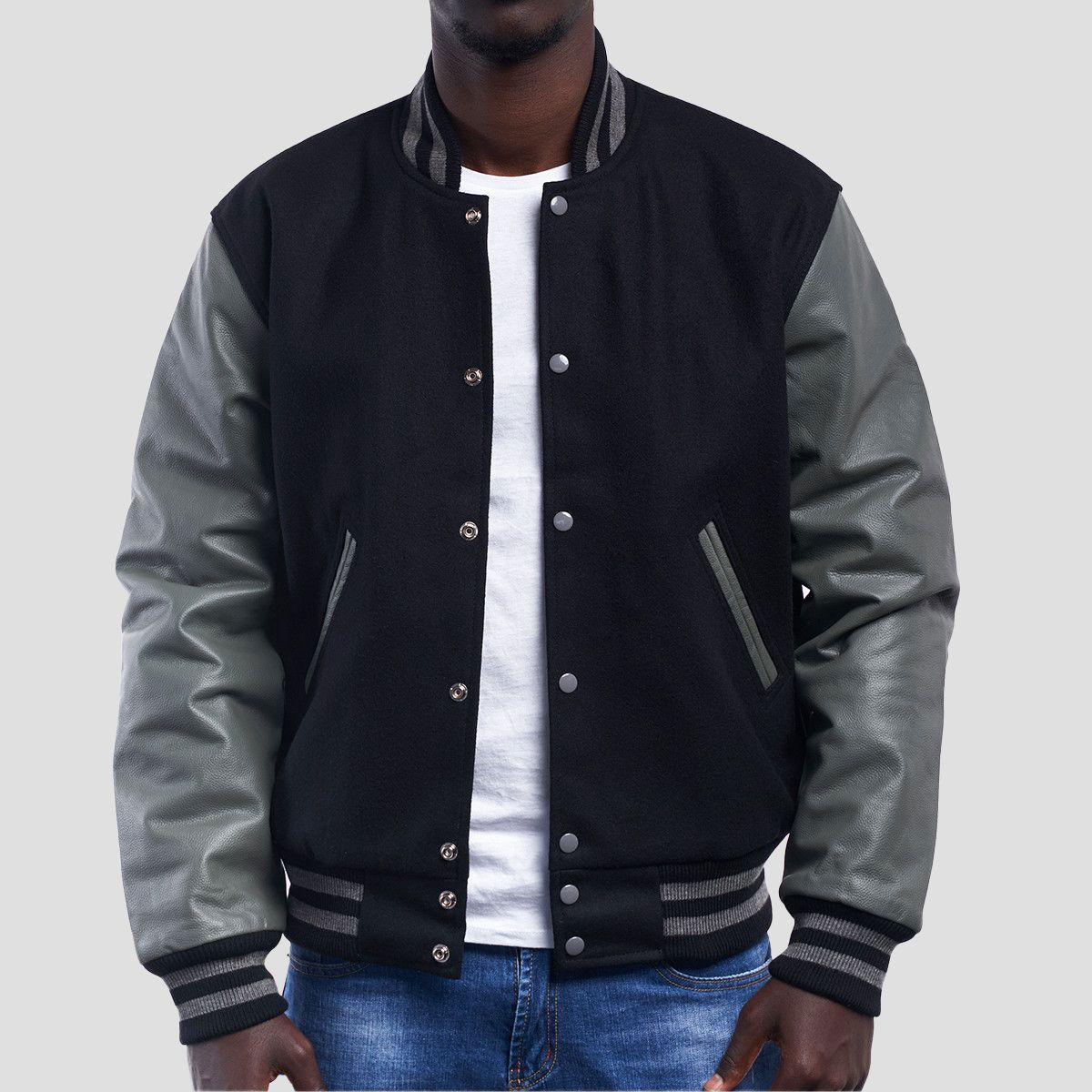 Black Wool Body & Grey Faux Leather Sleeves Letterman Jacket
