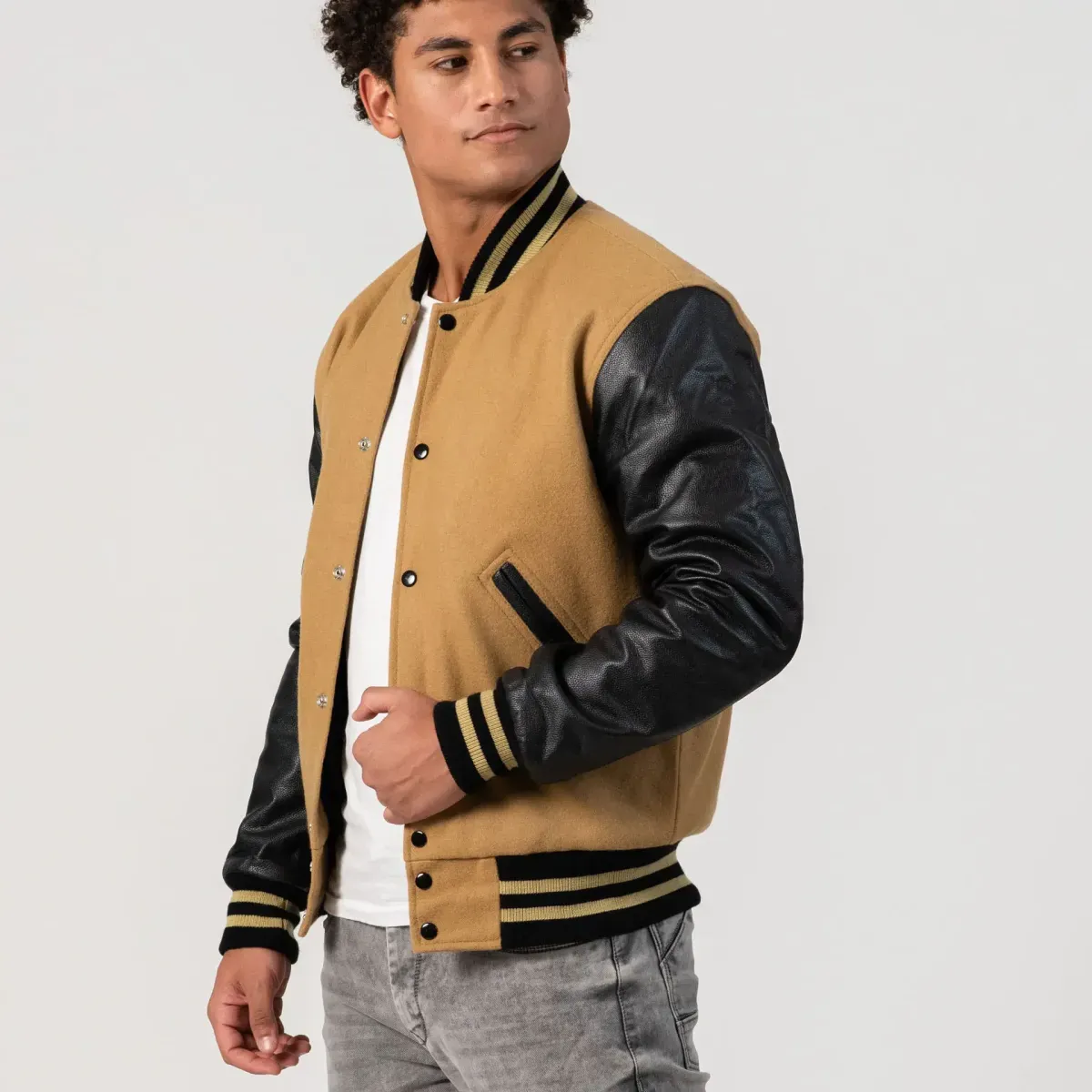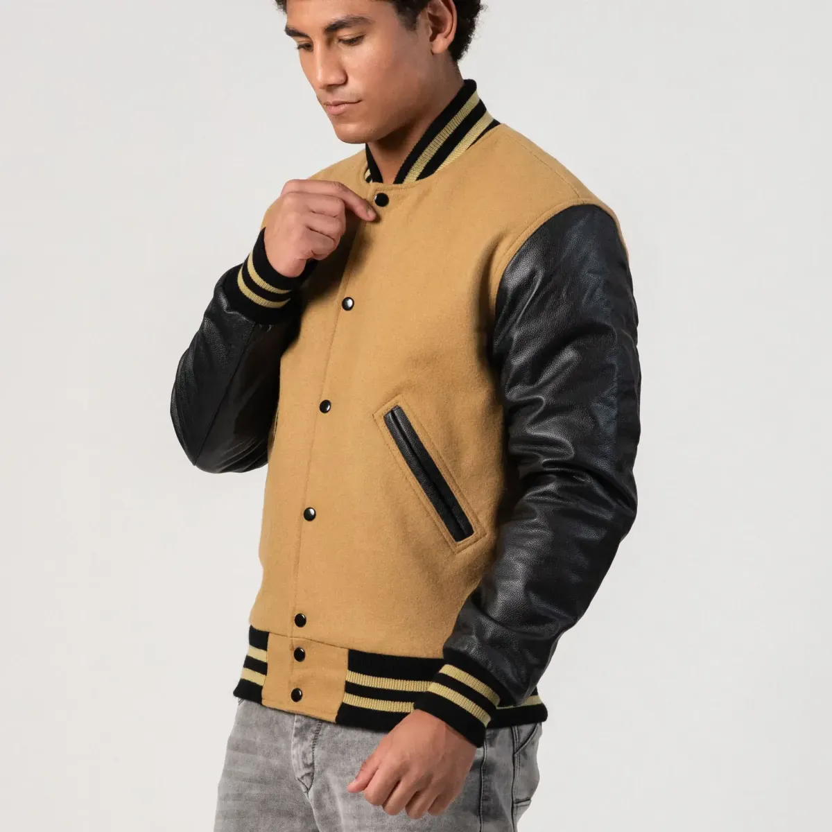 Camel Wool Body & Black Faux Leather Sleeves Letterman Jacket