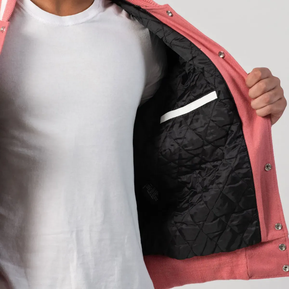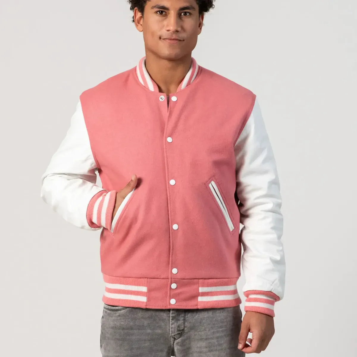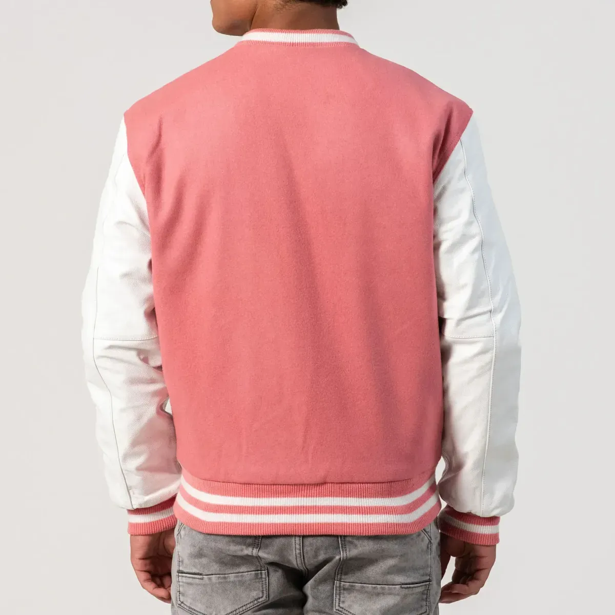 Pink Wool Body & White Faux Leather Sleeves Letterman Jacket