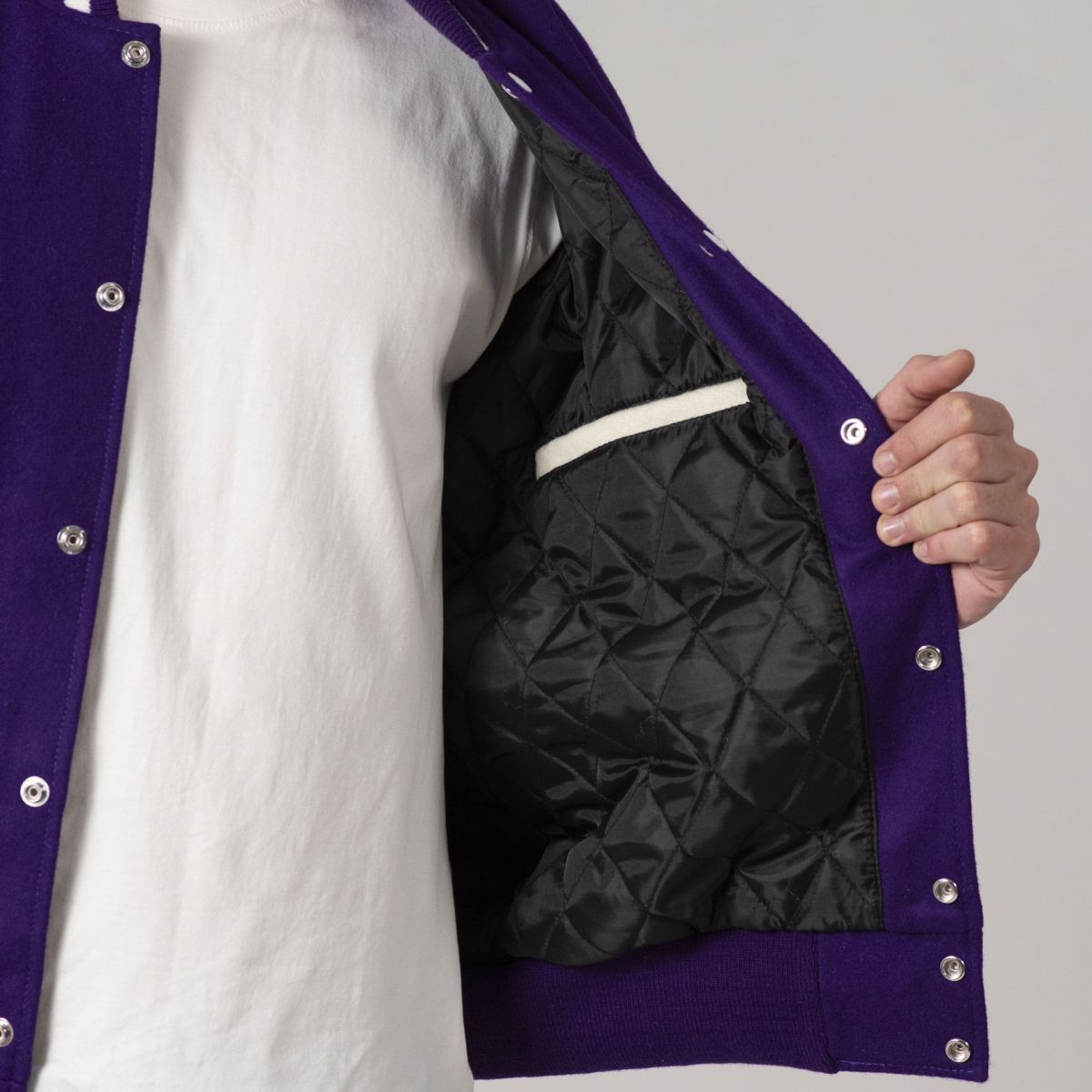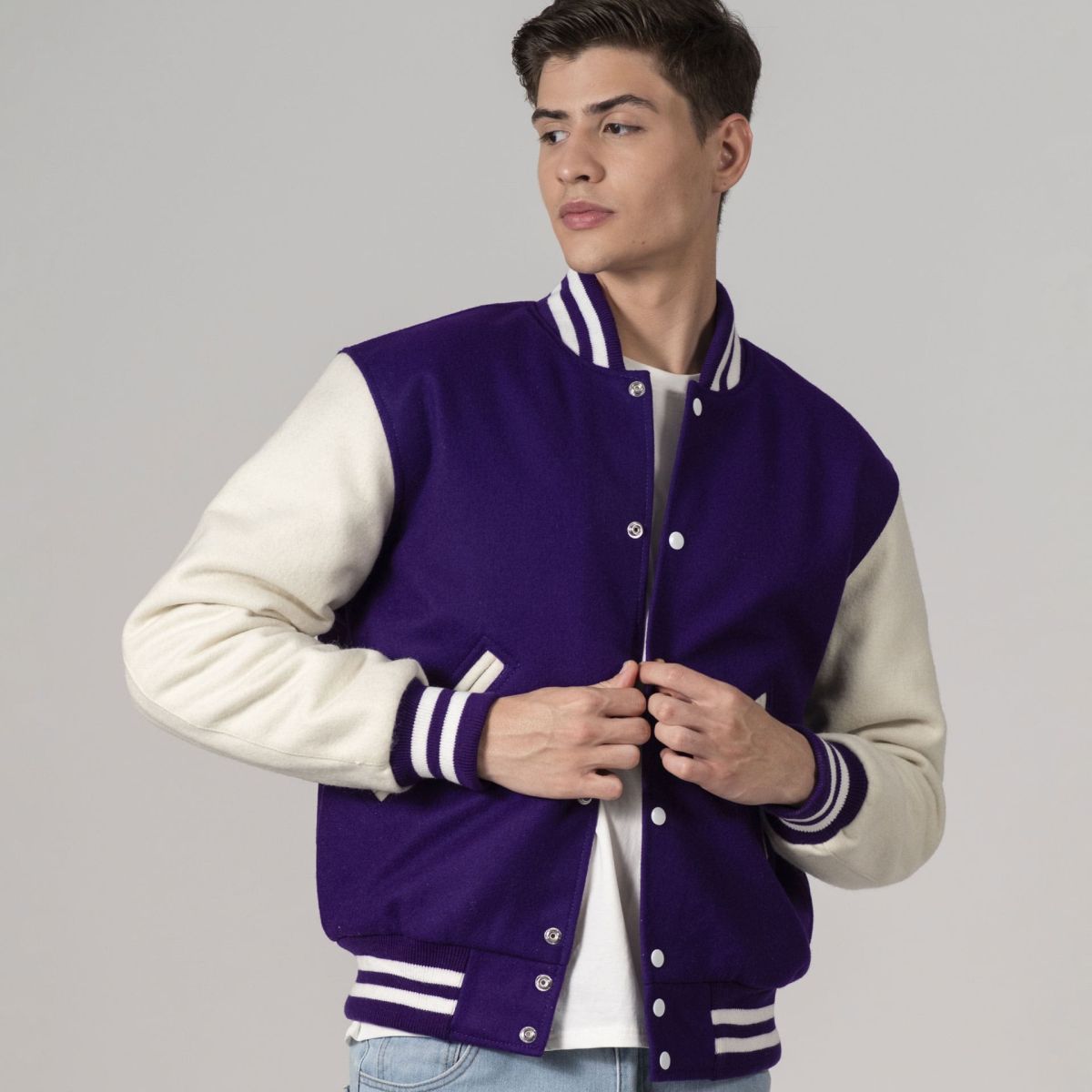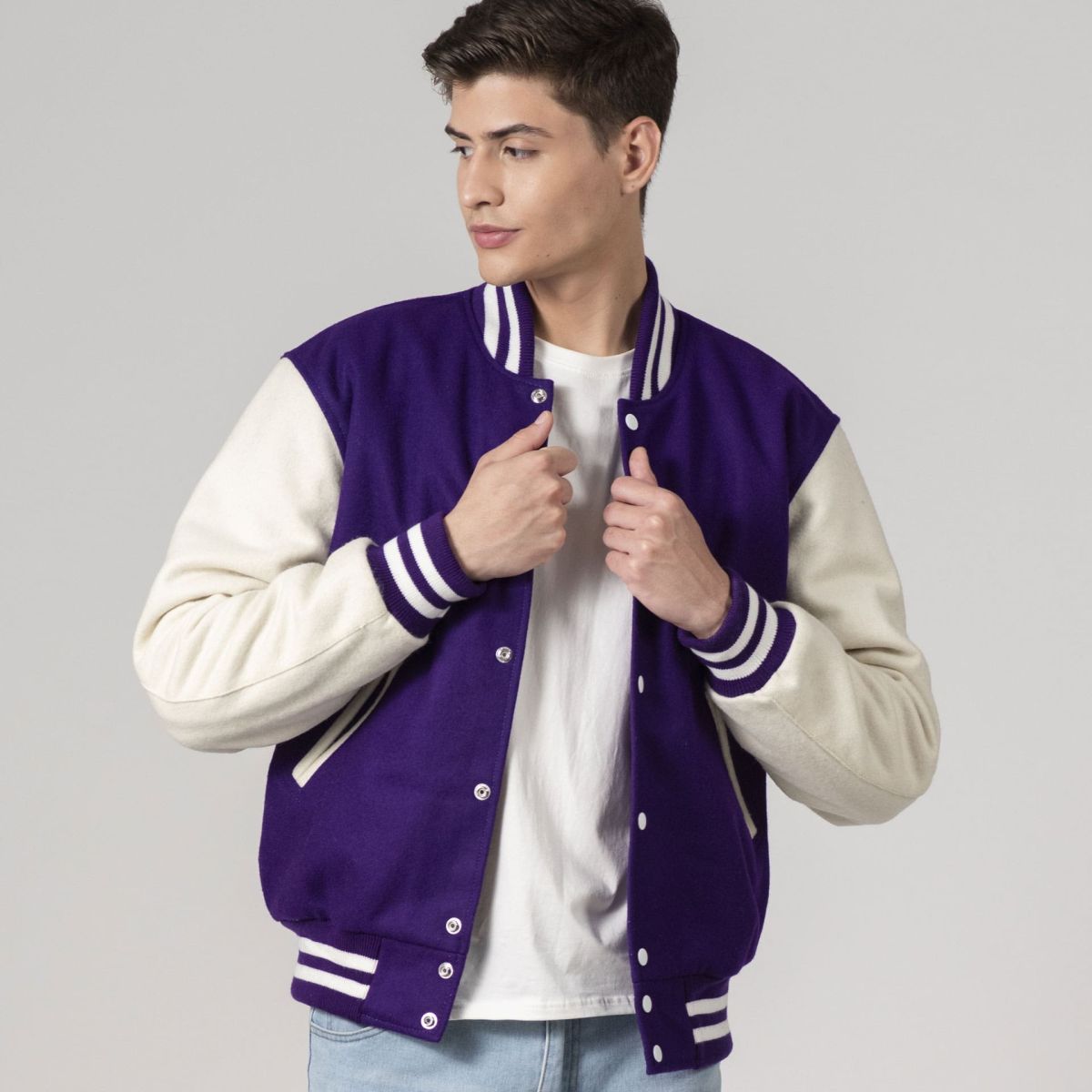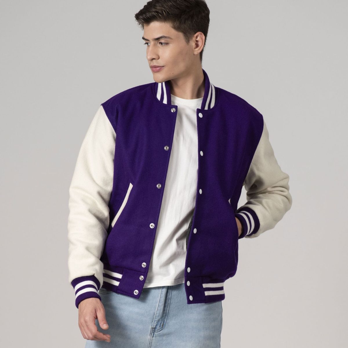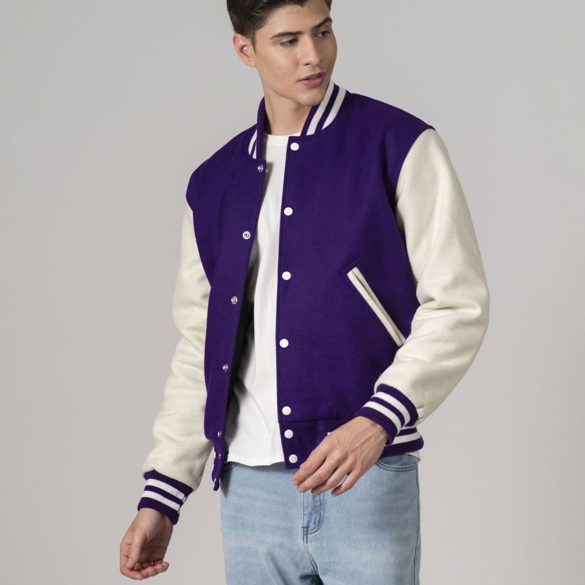 Introducing the Varsity Base All-Wool Customizable Letterman Jacket in sleek Purple and White. Crafted with premium wool, this jacket offers timeless style. With two side pockets, one inside pocket, and classic snap closures, it blends retro charm with modern convenience. Perfect for personalization, it's ideal for representing your team, school, or personal style. Elevate your wardrobe with this essential piece that stands the test of time.