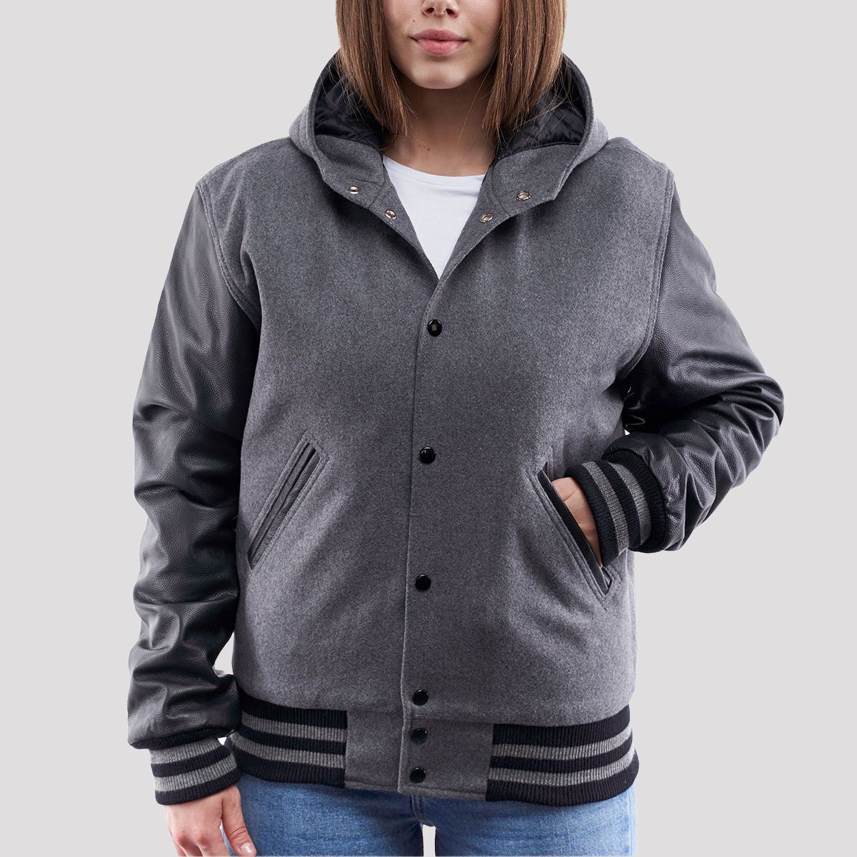 Light Oxford Wool Body & Black Sleeves Hoodie Letterman Jacket